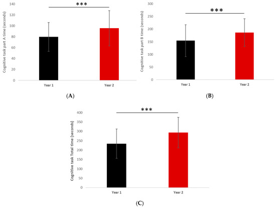 Results of the parts A and B (A,B) of the Trail Making Test and Total score (C) at T0 (year 1) and T1 (year 2). *** p < 0.0001.