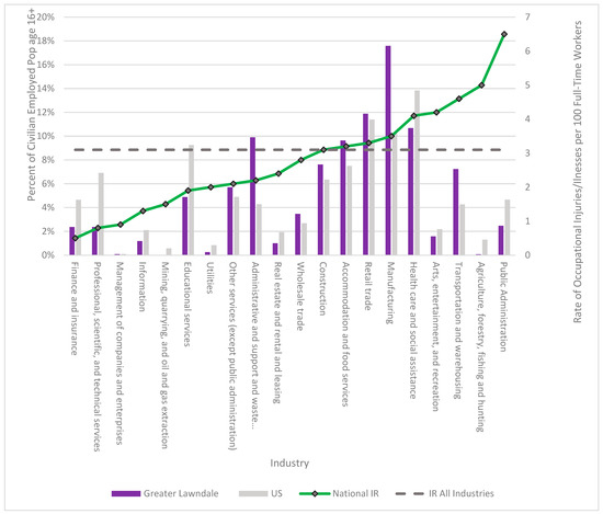 In terms of socio-economic indicators, individuals in Greater Lawndale (GL) report a higher proportion of employment in low-wage jobs that require less formal educational qualifications compared to the city of Chicago [48]. Residents of North Lawndale are mostly employed in retail trade and healthcare and social assistance, and residents of Little Village are mainly employed in manufacturing and accommodation and food services as well as administrative support and waste management. Some 80% of these jobs are in the private sector where more than 20% do not have any health insurance coverage. Non-standard work arrangements are associated with lack of benefits, low wages, and unstable employment with little to no safety regulation [48]. As such, they are largely unprotected by standard labor laws and workers’ and communities’ employment rights. Industries with the highest representation in GL also have higher incidences of injury and illness in comparison to average national and state (Illinois) injury/illness rate (Figure 1). When education level and individual earnings are considered, on average, individuals in the city of Chicago earn more money across all levels of education [47].