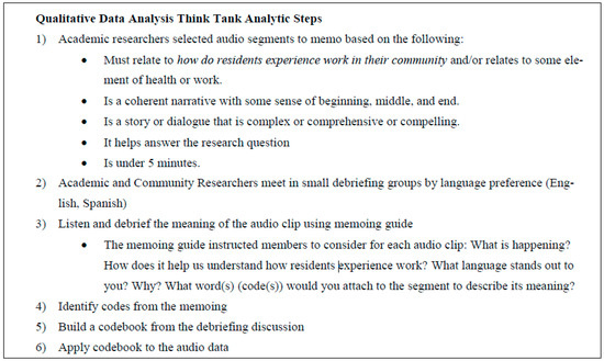 We formed an academic–community qualitative data analysis think tank [61] to engage in participatory memoing as part of the data analysis process to develop the codebook. We determined that the audio versions of the focus groups were better suited to memoing than verbatim transcripts, as we would be able to keep the data in their original language and preserve emotion, emphasis, richness. This would also enable us to avoid losing meaning in the data that may be lost in transcribing and translation. Developing the codebook through our think tank allowed for group code identification and processing of emergent themes, leveraging the expertise of all members (community and academic), and attended to issues of trustworthiness of the analysis, i.e., credibility [62]. The final codebook contained a few deductive, a priori codes but consisted mostly of more interpretive, grounded codes. Based on our participatory, iterative analytic process, we determined that we had developed a codebook suitable to the data and that theoretical saturation had been met. We used Dedoose as our computer-assisted qualitative data analysis software. See Figure 2 for the steps to the analysis.