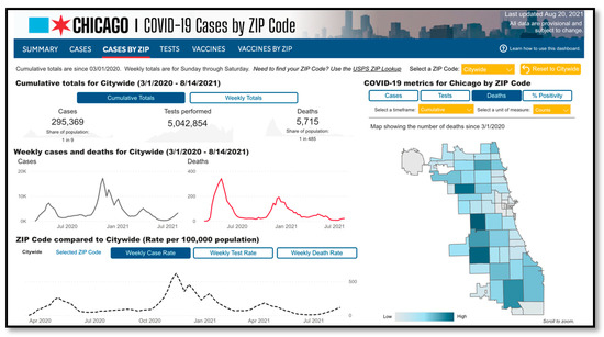- Chicago Department of Public Health COVID-19 Dashboard. Available online: https://www.chicago.gov/city/en/sites/covid-19/home/covid-dashboard.html (accessed on 20 August 2021).