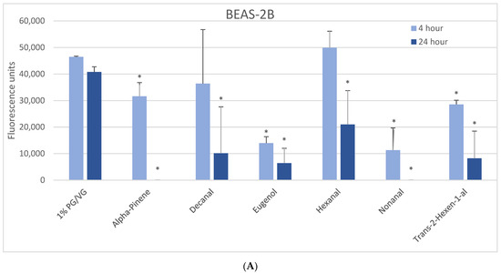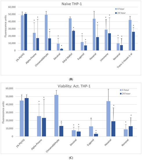 Viability effects of selected flavoring chemicals (1000 μM) after 4 and 24 h measured by alamarBlue fluorescence. (A) BEAS-2B cells, (B) naïve THP-1 cells, and (C) activated THP-1 cells. Data are presented as means ± standard error. Significance: * p < 0.05 as compared with vehicle control (1%PG/VG).