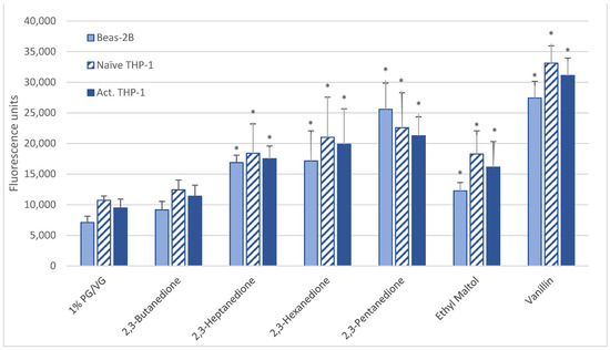 ROS measured with cell-permeable dye 2′,7′-dichlorofluorescin diacetate after 6-h treatment with 1000 µM of selected flavoring chemicals. Data are presented as means ± standard error. Significance: * p < 0.05 as compared with vehicle control (1%PG/VG).
