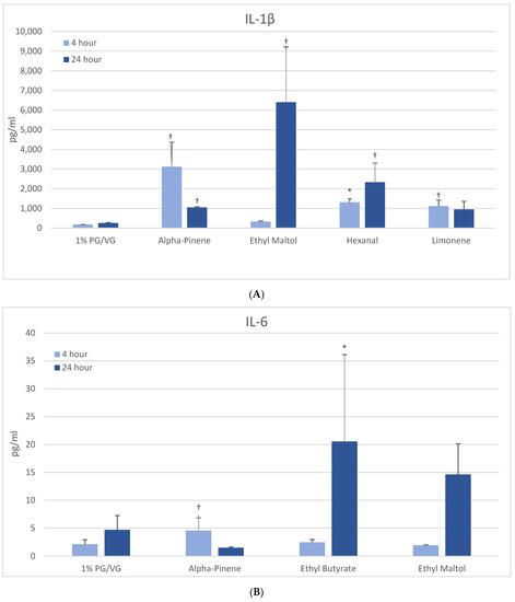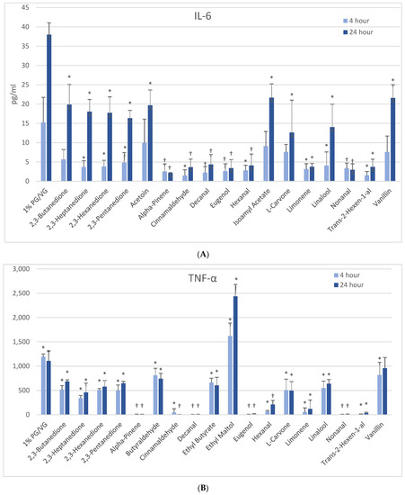 Cytokine production in activated THP-1 cells measured in cell supernatants after 4- and 24-h treatment with 1000 µM of selected flavoring chemicals. (A) IL-6; (B) TNF-α. Data are presented as means ± standard error. Significance: * p < 0.05 as compared with vehicle control (1%PG/VG) and † p < 0.05 with reduced viability (Figure 1).