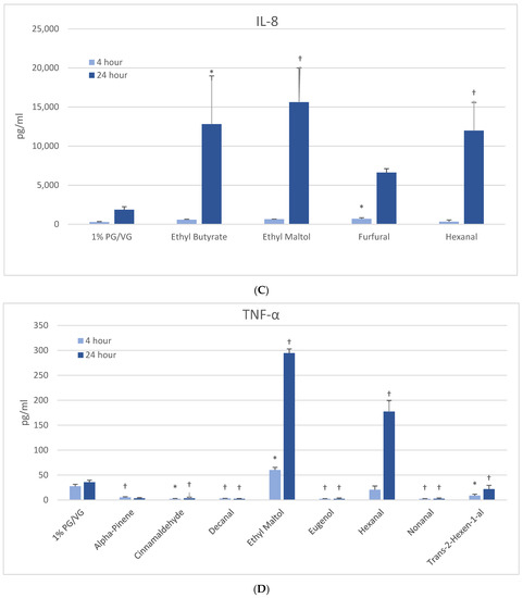 Cytokine production in naïve THP-1 cells measured in cell supernatants after 4- and 24-h treatment with 1000 µM of selected flavoring chemicals. (A) IL-1β; (B) IL-6; (C) IL-8; (D) TNF-α. Data are presented as means ± standard error. Significance: * p < 0.05 as compared with vehicle control (1%PG/VG) and † p < 0.05 with reduced viability (Figure 1). * p < 0.05, † p < 0.05 with reduced viability (Figure 1).