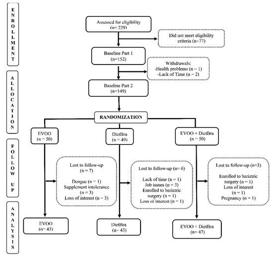 The individuals included in the study were randomized at baseline into three intervention groups, in the proportion of 1:1:1, using a randomization list generated by the site www.randomization.com (accessed on 1 October 2021). The groups were: (1) extra-virgin olive oil (EVOO); (2) traditional Brazilian diet (DieTBra); and (3) extra-virgin olive oil + DieTBra (EVOO + DieTBra) (Figure 1).