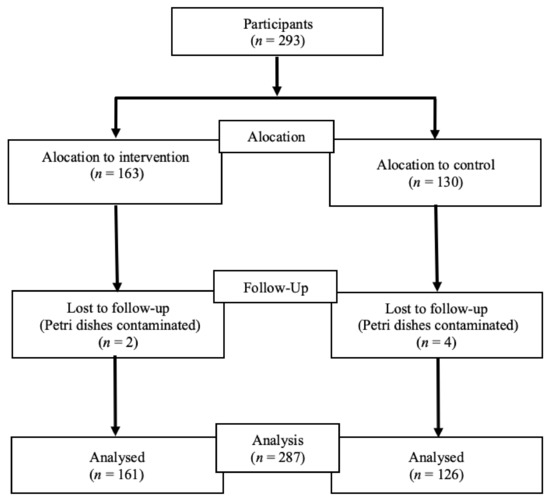 After the CFU count, six plates (two belonging to the intervention group and four to the control group) were found to be contaminated and were therefore excluded. As a result, the final number of participants was 287. Their sociodemographic and academic characteristics are shown in Table 1.
