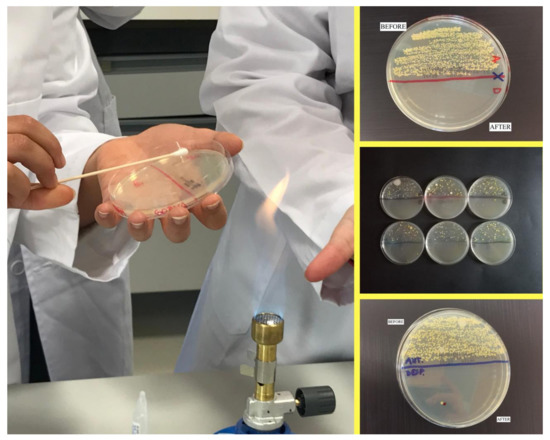The intervention consisted of two practice sessions per group led by the research team and an accredited laboratory technician. The first session lasted one hour and included a brief reminder of nosocomial infections, with special emphasis on the role of nursing professionals as the main vectors of transmission. The differences between the different HH techniques were defined, recalling the five moments recommended by the WHO, as well as the importance of keeping nails short, clean, and without nail polish or gel. Each student received two sterile swabs and a Petri dish with a previously identified agar culture. They then divided the plate into two equal parts to differentiate pre- and post-HH seeding and proceeded to sample and culture the non-dominant hand in the pre-HH part. Škodová et al. [25] confirmed that the most contaminated areas after HH are the thumbs and interdigital areas of the non-dominant hand. The decision was made to sample only that hand, in line with Cruz and Bashtawi [32], Elola-Vicente et al. [21], Silva et al. [33], and Škodová et al. [25].
