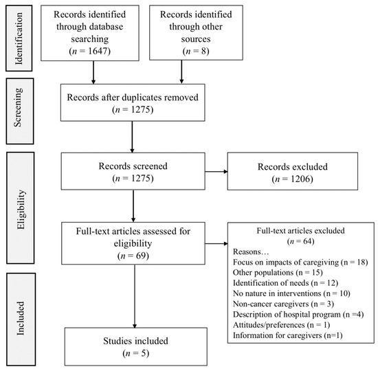 Inclusion criteria focused on: cancer caregivers, nature interventions (indoors or outdoors), and health outcomes. Exclusion criteria included professional caregivers and those that were non-cancer related. The two searches produced 1647 results. This was: CINAHL: 226; Alt HealthWatch: 9; PsycINFO: 293; PubMed: 920; Scopus: 196; Cochrane: 3. After duplicate removal, there were 1275 articles for review. Searching for references through article bibliographies was also conducted, yielding 8 additional references. An additional 773 articles and 8 books were removed due to being off topic or patient rather than caregiver focused, leaving 69 articles. Other reasons for exclusion of articles were non-cancer caregivers, lack of nature experience in the publication, hospital-based programs that did not include the friend or family caregiver, information for caregivers rather than information about caregivers, and studies of attitudes rather than health outcomes.