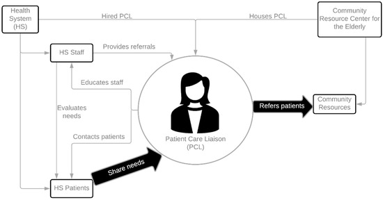 - Boll, A.M.; Ensey, M.R.; Bennett, K.A.; O’Leary, M.P.; Wise-Swanson, B.M.; Verrall, A.M.; Vitiello, M.V.; Cochrane, B.B.; Phelan, E.A. A Feasibility Study of Primary Care Liaisons: Linking Older Adults to Community Resources. Am. J. Prev. Med. 2021. [Google Scholar] [CrossRef] [PubMed]