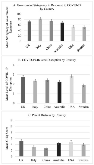 As illustrated in Figure 1, there were between-site contrasts in national government stringency scores (F(5) = 755.84, p < 0.0001, η2 = 0.60) and in the experience of COVID-19-related social disruption (F(5) = 38.34, p < 0.0001, η2 = 0.07). Due to the frequency of planned post-hoc contrasts, we applied a more stringent alpha rate (p < 0.003). In terms of stringency scores, there were significant contrasts between most countries, aside from between China and Sweden. For COVID-19-related social disruption, families in the USA experienced a greater level of disruption compared to families in all sites, aside from the UK, while families in Sweden reported less disruption than all sites, except for Australia. Families in the UK reported more disruption than those in Italy, Australia, and Sweden.