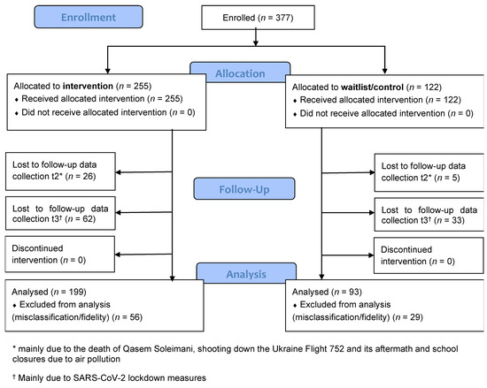 Sampling utilized an opportunistic ‘universal’ approach, in which research assistants recruited families from the general population, without targeting any particular risk group. Clinical diagnoses were not assessed in participants; however, during the first session, caregivers were provided with leaflets of information on where they might access help, in case they observe severe stress reactions or any other physical, mental, or sexual health concerns they might have for themselves or their children. Inclusion criteria in the programme and the study included speaking Farsi, willing to take part in the programme, and being in the town for the duration of the whole study and measurement meetings. Families were excluded from the study if they had taken part in any other family skills training programme during the last 24 months or if the caregiver and child lived separately. Non-biased allocation to the intervention or waitlist/control group was performed only after the first data collection by convenience, i.e., availability of the families. Participants in the intervention group were then told to attend the first programme session on the same day, whereas families in the waitlist/control group were informed to attend the next data collection point 5 weeks later (2 weeks after the intervention group had completed the programme).