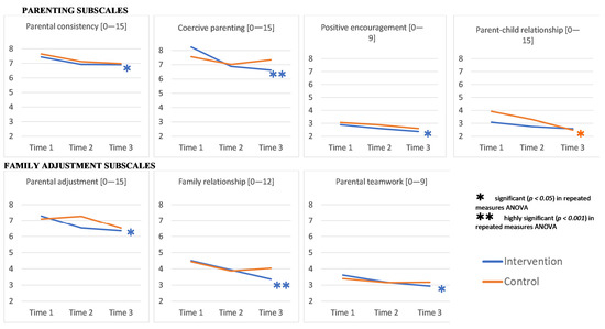 Over time, we found (highly) significant improvements in caregivers in the intervention group on all subscales apart from “parent-child relationship”, that were not found in the waitlist/control group, as shown in Figure 3.