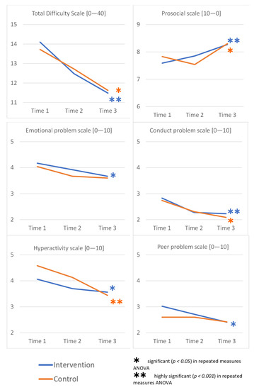 Overall, there were (highly) significant changes in scores in the intervention group on all subscales and accordingly on the “total difficulty scale”. In the waitlist/control group the overall SDQ score also significantly improved over time and we noted the improvement on three of the five SDQ subscales (prosocial, conduct problems and hyperactivity). However, no significant change over time was noted on the “emotional problem scale“ or the “peer problem scale“ in the waitlist/control group, as shown in Figure 4.