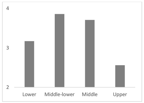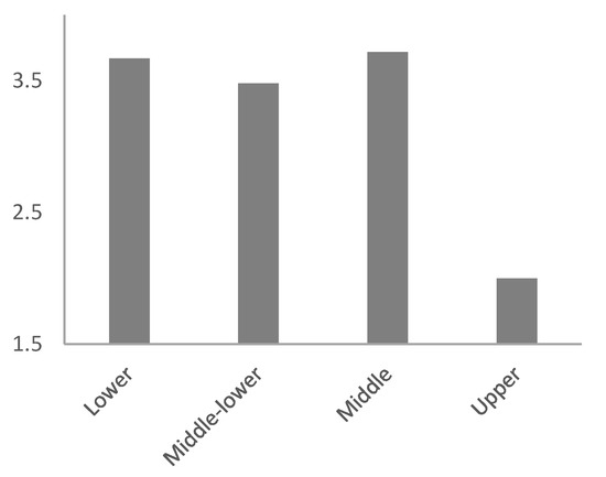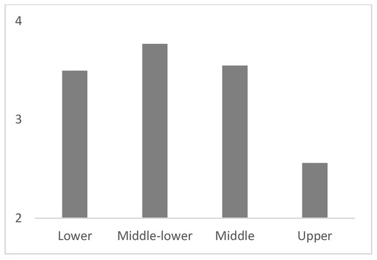 Table 2 shows non-significant differences by gender and age for each of the study variables. Similarly, Table 3 displays the absence of significant differences according to teaching experience, educational level, and socioeconomic status of the student’s families. However, there were differences regarding the difficulty in establishing relationships of trust with students (statement 10). Specifically, in comparison to teachers working in upper class students’ schools, teachers working in middle- and low-class students’ schools found it much more difficult to establish, with blended learning, a socio-affective relationship between students (p = 0.003), and between teachers and students (p = 0.025; Figure 1 and Figure 2). In addition, significant differences were found in the lack of technological means of the students as a limitation (statement 9), regarding the socioeconomic status of the students’ families. Particularly, teachers who work in middle- and low-class students’ schools considered both the lack of technological means of the students and the lack of knowledge in the use of information and communication technologies (ICT) by students as a limitation to a greater extent than teachers working in upper class students’ schools (p = 0.022 and p = 0.038, respectively; Figure 3 and Figure 4).