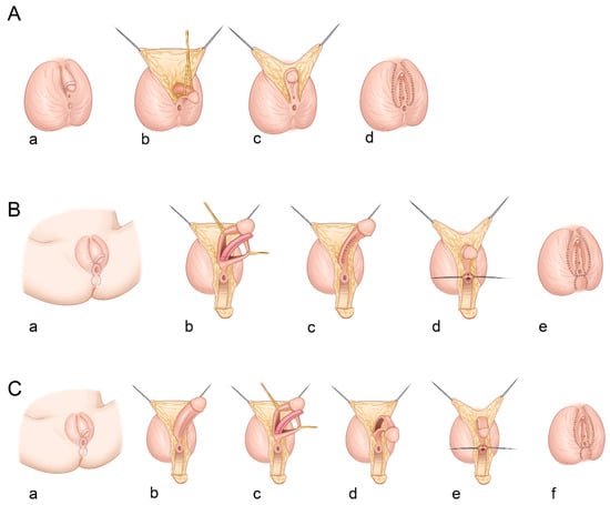 Surgical techniques of clitoroplasty: (A) recession clitoroplasty without reduction of corporal tissues (a–d); (B) reduction clitoroplasty method in which the incision line is depicted in blue dot (a), the corporal bodies are excised with preservation of the glans clitoris and neurovascular bundles (b,c), and the posterior vaginal wall is reconstructed with the perineal skin flap (d,e); (C) girth-reduction clitoroplasty in which the glans and corporal bodies are divided in the coronal plane and the ventral portions of the shaft, and glans are excised (b,c), the dorsal neurovascular bundles are preserved (d), and the remaining portion of the clitoris is bent in a hairpin configuration by suturing the exposed surfaces of the corporal bodies (e,f).