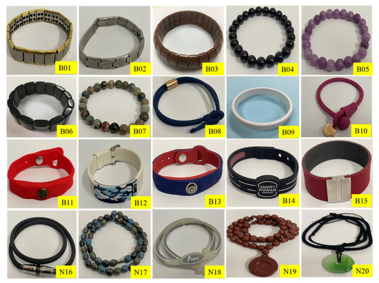 A total of 15 bracelets and five necklaces were purchased online, noting manufacturer claims that the products generate negative ions, devoid of supporting scientific detail. Upon delivery, no evidence was found of information as to the radioactivity contained within. For analysis, these bracelets and necklaces were coded as B01-B15 and N16-N20, respectively (Figure 1). The activity of the individual radionuclides 238U, 232Th, and 40K contained within the samples were measured via gamma-ray spectrometry (using an ORTEC GEM Series P-type coaxial HPGe spectrometer, GEM20-76-LB-C-SMPCFG-SV-LB-76). The facility offers 33% relative efficiency and 1.8 keV full-width at half maximum (FWHM) at 1332 keV, providing spectroscopy within the photon energy range 40 keV to several MeV. Each sample was counted for a period of 24 h to ensure highly reliable counting statistics, and the measurement process was replicated twice for each sample. Gamma Vision 8.1 software was used for spectrum acquisition and analysis. Calibrations were made using a 152Eu standard point source, providing photon energies of 121.78, 244.6, 344.3, 411.1, 778.9, 867, 964, 1112, and 1528 keV. The activity of 238U was estimated from the primary sources 214Pb (295, 351) keV, and 214Bi (609, 1764) keV, as these line energies have a high probability emission of gamma [19]. Regarding 226Ra, the line energy 186 keV has not recorded significant difference activity from its daughters (214Pb and 214Bi) due to the secular equilibrium. Concerning the activity of 232Th, comprising 228Ra estimated from both gamma lines of 228Ac (338, 911) keV, 228Th estimated from the resulting gamma lines of 212Pb (238 keV) and 212Bi (727 keV); 208Tl (583, 2614) keV, with 232Th estimated from the average of 228Ra and 228Th.