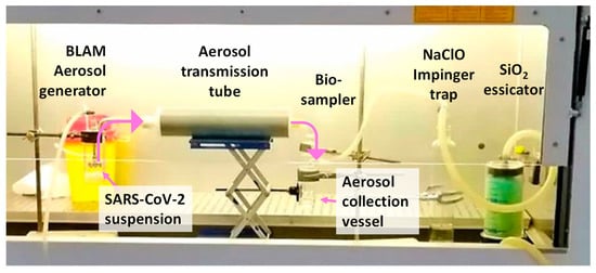 Experiments on residual infectivity after virus aerosolization were conducted in a Celbio Model Jupiter 6 biosafety cabinet class II within the BLS3 facility of the San Polo hospital (ASUGI, Monfalcone, GO, Italy), in a sealed experimental bio-aerosol measuring train assembled as it follows. A BLAM aerosol generator (CH Technologies Inc., Westwood, NJ, USA) hosting the SARS-CoV-2 suspension in its precious jar, received an air flow—produced by AERO Particle Nebulizer pump (TCR Tecora Srl—Cogliate, MB, Italy) which is positioned outside the cabinet—generating the bio-aerosol. The BLAM aerosol generator has a filtered inlet (0.2 μm) allowing entrance of air needed to sustain the air flow in the measuring train, as detailed in the next paragraph. The aerosol is transferred into a 300-mm long and 75 mm of diameter PP cylindrical aerosol transmission tube, and from it, to a Biosampler (SKC Inc., Eighty Four, PA, USA), collecting the aerosolized SARS-CoV-2 into a collection vessel. The virus particle collection into the Biosampler is sustained by an aspiration flow of 12.5 L per minute, generated by a Bio-Bravo sampling pump (TCR Tecora Srl, Cogliate, MB, Italy). A glass impinger with sodium hypochlorite working as safety trap deactivating eventual unsampled pathogens, and a dryer filled with silica protecting the pump from vapors are posed online after the Biosampler and before the Bio-Bravo. All connections were prepared in nylon with o-rings by the mechanical workshop of the Dept. of Chemical and Pharmaceutical Sciences of the University of Trieste. The bio-aerosol measuring train has been preliminary set up and tested with E. coli BL21-DE3. An image of the bio-aerosol measuring train is shown in Figure 1. A detailed scheme of the bio-aerosol measuring train and images of the aerosol generator and the Biosampler are reported in the Supplementary Materials, respectively as Supplementary Figures S1–S3.