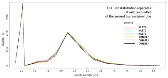 Size distribution replicates determined by Optical Particle Counter, reporting average number concentrations (particle counts/liter) for each of the 20 dimensional bin spanning the range from 0.25 to 5.0 μm (particle diameter of the center of the bin, in micrometers). Three replicate cycles (16 size spectral acquisition each) are measured at the inlet (3 runs) and three cycles were acquired at the outlet of the aerosol transmission tube.