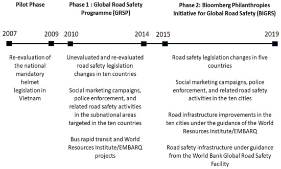 The scale of the problem is large, and the funding needed to address it, especially in LMICs, has in the past been inadequate [3]. To help address this lack of resources, numerous international, national, and local programs have been established, and extensive literature has been published on their effectiveness for saving lives. In this paper, we focus on the initiatives funded by Bloomberg Philanthropies (BP) and implemented by their partner organisations (Appendix A) within three phases of the Bloomberg Road Safety Program. Initially, a $9-million pilot program was undertaken between 2007 and 2009, the Bloomberg Pilot Road Safety Program (Pilot Phase (2007–2009)). This program funded the publication of a Global Road Safety Status Report [5], with additional reports released over the next decade to monitor the progress of countries worldwide. The program also funded the implementation of country-based demonstration projects with the purpose to highlight what could be achieved through cost-effective road safety interventions [6], which have proven to be effective in high-income countries [7,8]. A significant activity in this program was the introduction of the national mandatory helmet legislation in Vietnam [9]. In 2010, the pilot was expanded, with BP committing $125 million over five years to the Global Road Safety Program (GRSP (2010–2014)) [10]. This funding targeted 10 LMICs (known initially as the Road Safety in 10 countries (RS-10) project [11]), which accounted for almost half of global road traffic-related deaths [10]. The remit of this commitment was to (1) strengthen road safety legislation; (2) implement life-saving interventions that increased seatbelt, child-restraint, and helmet use and reduced speeding and drunk driving; (3) survey road networks and recommend infrastructure improvements; (4) build sustainable transport alternatives; and (5) improve the collection of data to evaluate project effectiveness and better target interventions [10,11]. Extensive effort during this time was undertaken to create baseline datasets for local road crash fatalities and risk factors in Brazil [12,13], Cambodia [14,15,16,17], China [18,19,20], Egypt [21,22,23], India [24,25,26,27,28], Kenya [29,30,31,32], Mexico [23,33,34], Russia [23,35,36], Turkey [23,37,38], and Vietnam [39,40,41,42]. These datasets have fed into subsequent global status reports [1,43]. However, data availability and quality issues still exist [3]. In addition to the GRSP (2010–2014) funding of interventions to promote road safety and facilitate changes in road safety legislation, BP also funded investigations into the road safety impacts of high-performance bus rapid-transit systems and busway design features in nine Bus Rapid Transit (BRT) systems around the world [44]. These interventions complemented road infrastructure improvements by the World Bank and World Resources Institute/EMBARQ in other selected countries [45].