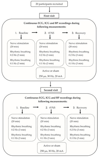 The measurements were performed on two different days, with a minimum wash-out period of 24 h. Continuous ECG, impedance cardiography (ICG) and continuous BP recordings were assessed under changing stimulation conditions (Figure 1). First, median nerve excitability was measured by using the threshold-tracking method for the forearm, followed by a rhythmic breathing exercise before (baseline), during and after (post-stimulation) an active or sham transcutaneous vagus nerve stimulation (tVNS), with each part lasting around thirty minutes. After the experiment, subjects rated their subjective pain during the electrical stimulation on a numeric analog scale (NAS) ranging from 0 to 10. Subjects were told to refrain from caffeine, nicotine and alcohol consumption for at least three hours before each scheduled measurement, and no medication, except for contraceptives, was allowed.