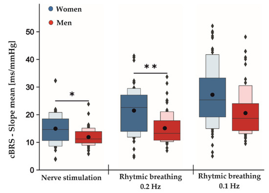 Main sex effects in cBRS during different phases of the experimental protocol independent of active and sham stimulation. Men displayed an overall significant lower total cBRS than women during nerve stimulation and rhythmic breathing at 0.2 Hz and non-significantly at 0.1 Hz. The dark-colored boxes depict 50% of all the data points. Together with the light-colored boxes, they represent 75% of all the measured data. While the black dots represent the means averaged over all conditions (baseline, tVNS and post-stimulation) for the indicated tasks, the gray lines within the boxes show the respective medians; * p < 0.05; ** p < 0.01.