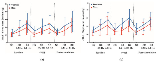 Similarly, spontaneous cBRS during the Valsalva maneuver was comparable between the two sexes during the decrease of BP, but lower for women during the increasing BP phase [13]. Depending on the assessment method used, these results may suggest that BP changes affect cBRS differently between the sexes in young healthy subjects. The sensitivity of the baroreceptors is defined as the ratio of the temporal change between two consecutive R waves (length of RR intervals, where R is defined as the peak of the QRS complex in the electrocardiography (ECG)) in milliseconds per unit change in systolic BP, measured in millimeters of mercury [14]. Spontaneous cBRS can be calculated by using non-invasive techniques, such as the sequence method or the transfer function [14,15,16,17]. Using the sequence method for a large healthy cohort, total cBRS was found to be lower in women than men; however, this was only for age groups under 50 years. Above 50 years, total cBRS was higher within women [18]. Other data also suggest that sex differences in cBRS change upon age, with older subjects showing either no differences or higher cBRS for women [8,17,19].