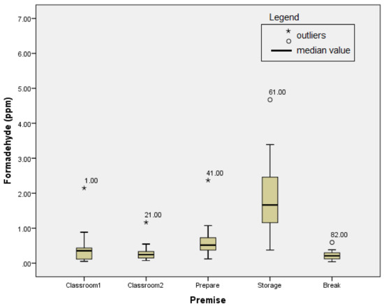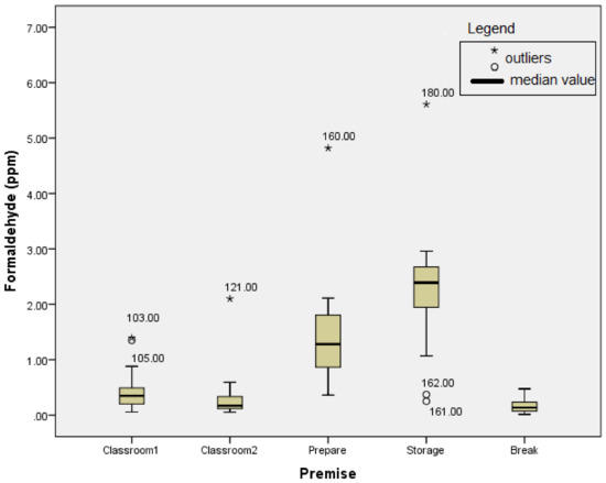 In order to make a more objective assessment of the obtained results of the measurement of FA concentration levels, all outliers were identified and eliminated from further statistical analyses. After removing the outliers, all variables satisfy the assumption of the distribution normality concerning the skewness and kurtosis values. The highest average value of the FA TWA concentration during the first campaign was observed in the storage room, which was identified as the dominant source of emission during the first sampling campaign.