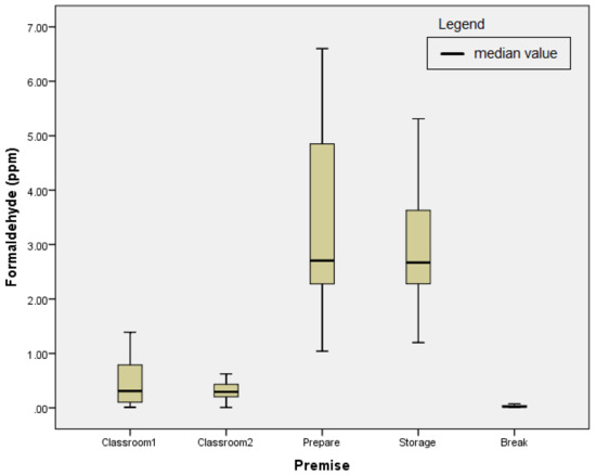 In order to identify the workplace most exposed to the influence of FA at the department, a single-factor analysis of variance was carried out to determine the existence of statistically significant differences in FA concentrations in different premises. A statistically significant difference at p < 0.05 was found in five different rooms. In addition to the statistical significance, a large effect size was determined according to Cohen’s criteria η2 = 0.53. Subsequent comparisons with the Tukey’s HSD test identified the storage room (M = 2.33 ppm, SD = 0.97) as the dominant FA source at the department by comparing the results of all three campaigns, with a statistically significant difference concerning all premises at the department. The concentration of FA in the preparation room (M = 1.79 ppm, SD = 1.62) was also statistically significantly higher than the concentrations in other premises at the department: Classroom 1 (M = 0.37 ppm, SD = 0.32), Classroom 2 (M = 0.26 ppm, SD = 0.16), and break room (M = 0.14 ppm, SD = 0.14) among which statistically significant differences in the concentration levels of FA were not detected. During the third campaign, the preparation room was identified as the most reliable source of FA, due to the extraction of a large number of anatomical specimens from formalin during the preparation of pre-examination training exercises. Despite this fact, the storage room is considered as the most potent source of FA emissions in the department, due to the constant FA emissions throughout the year, and not only during specific periods (Figure 5).