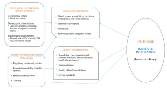 Patients’ demands, coupled with political influence, have contributed to the current interest in merging traditional and orthodox health systems into what is now labelled an integrated health system [15]. For example, in most Asian countries, the use of TM is prevalent, although the orthodox health system is readily available. In China, TM accounts for about 40% of all healthcare services delivered and is used to treat about 200 million service users yearly, whereas in Japan, 60–70% of orthodox medical doctors prescribe TM for service users [3]. For developing countries such as Zambia, Nigeria, Mali, and Ghana, TM is used particularly among rural residents in treating children with fever at home because it is readily available [3]. The inclusion of complementary and traditional medicine (TM/CAM) in medical schools’ curricula in the United Kingdom and United States of America has also been highlighted in the literature [3]. Clearly, TM is increasingly being adopted into the orthodox health system as well as the medical curriculum [15,16]. This implies that the orthodox health system (knowledge, practices, organisation, and social roles of medicine in westernised cultures [17]) has moved from an opposing viewpoint to a gradual acceptance of integration with TM [15,18]. The practice of integrated health system engages the orthodox and traditional health systems in delivering health service to populations. TM integration into formal health systems is categorised into three groups (integrative, inclusive, and tolerant health systems) on the basis of the level of incorporation, mainly in the areas of regulation, education, monitoring, and health financing schemes [3].