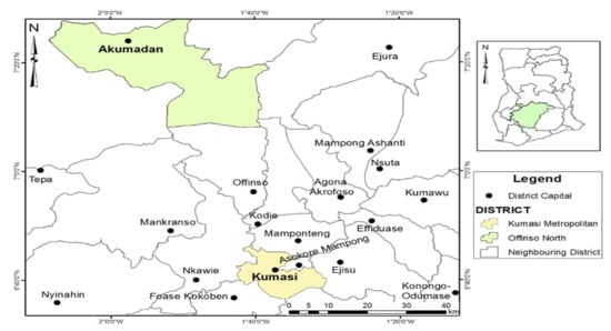 Map of Ashanti region showing the study sites (Kumasi metropolis and Offinso north district). Source: GIS unit of the Department of Geography and Regional Planning [41].