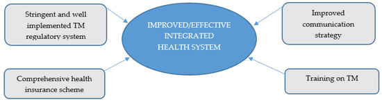 It has been reported that integration is achieved at three levels: the individual (patient/client, health practitioners), institutional (health facilities), and societal (professional/regulatory level/health policy/system) levels. Integration at the individual level comprises the interaction between and among service users, orthodox medicine (OM) practitioners, and TM practitioners, while institutional integration is achieved at the health facilities level where hospital administrators also operate. Societal integration focuses on political will and health policy frameworks [5,15,31,32]. The acceptance of TM integration by orthodox health practitioners and hospital administrators, regardless of their place of operation, is critical to the success of the integration because they are key stakeholders in the health delivery system [6]. A successful TM integration in Ghana at the local and national level would demand active collaboration between all stakeholders [21]. Ghanaians should be enlightened on the official integration of TM into the health system as well as monitor the operations of TM practitioners and products to ensure quality of healthcare.