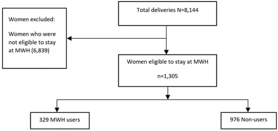 Among the 1305 eligible women, 329 MWH-users (women who delivered after having stayed at the MWH) and 976 non-users (women who delivered but had not stayed at the MWH) were compared on maternal and perinatal outcomes. Non-users were identified based on the assumption that they met the same admission criteria as users (see Table 1). We identified MWH users and non-users by following the elimination process as shown in Figure 1.