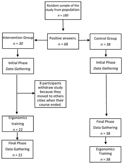 The quantitative dependent variable was obtained by the total sum of awkward postures; thus, data analysis was performed using generalized linear models, applying the generalized linear models method, the generalized estimated equation, with Poisson distribution and with log link function. Thus, 20 participants per group were determined as the minimum sample size [27]. Considering the possibility of losses due to participant abandonment during the research period, 30 participants were decidedly allocated to the intervention group and 38 to the control group.