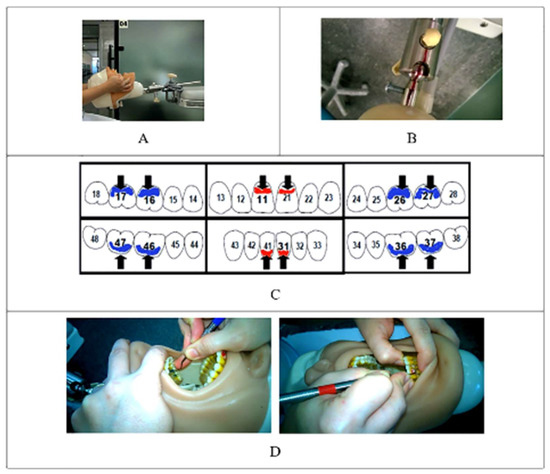 Attachment of the phantom head to the patient’s dental chair and organization of the dental procedure. (A) Phantom head attachment to the patient’s dental chair; (B) Control of the phantom head motion by means of boundary lines; (C) Dental surfaces to be cleaned; (D) Identification of anterior and posterior curettes by means of colors.