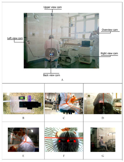 Device built to support cameras 1 to 4, camera 5 positioning and views obtained by each of the cameras. (A) Positioning of the 5 cameras; (B) Transparent acrylic support with the parameters and limits of angular inclinations and bubble levels to keep cameras straight; (C) Right view; (D) Back view; (E) Left view; (F) Upper view; (G) Overview camera.