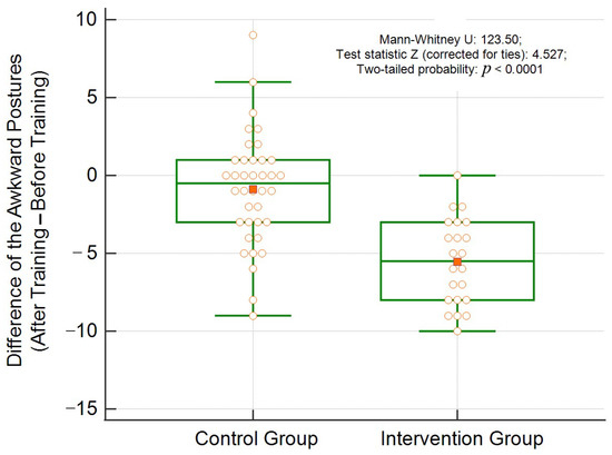 Distribution of the difference between the scores of awkward postures after and before training, according to the groups.