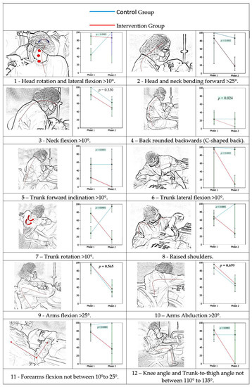 Images 1 to 12 of Figure 6 reveal that, in only three of the twelve posture requirements which evaluated the ergonomics training, there were no statistically significant differences between the control and intervention groups. Regarding inadequate neck flexion postures greater than 25 degrees (requirement 3), we found that there was a marked decrease in both the intervention and control groups, with no statistically significant difference (p = 0.330) after ergonomic training in the intervention group. A similar situation occurred with inadequate postures of upper arm flexion greater than 25 degrees (requirement 9) and upper arm abduction greater than 20 degrees (requirement 10), in which statistical significances were p = 0.565 and p = 0.699, respectively.