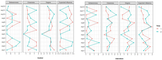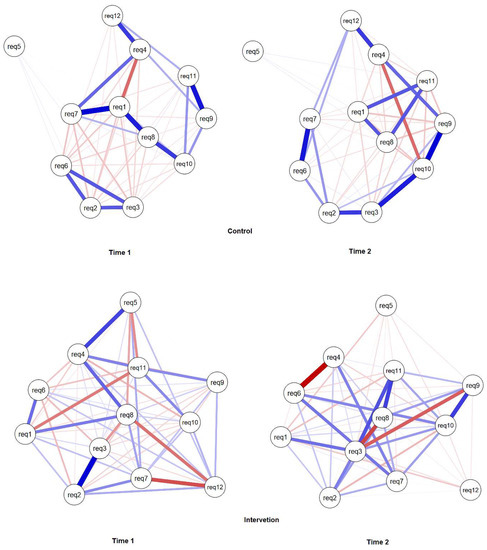 Figure 7 and Figure 8 shows results from the analysis of networks, which were randomly distributed in the control and intervention groups at phase 1. Networks comprise graphical representations of the relationships (edges) between variables (nodes). Network analysis provides the capacity to estimate complex patterns of relationships and the network structure can be analysed to reveal core features of the network.