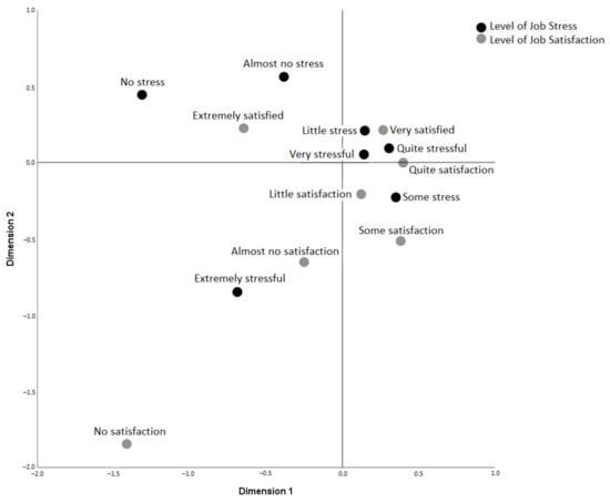 As previous studies have already pointed out [16,22], we found a significant relationship between job stress and job satisfaction, very evident in the extreme categories of stress, as shown by the simple correspondence analysis. It is also interesting to observe how the intermediate categories are related to each other. The somewhat stressful category is equidistant from the little, somewhat, and fairly satisfying levels. The fairly stressful category is also equidistant from being fairly or very satisfied. The differentiation between distress and eustress may be behind these results [23]. High levels of stress correspond to negative stress (distress) and, therefore, not at all or almost not at all satisfactory, and medium to low levels correspond to positive stress (eustress), which is closer to the highest levels of satisfaction.