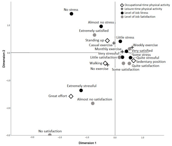 Moreover, do not exercise leisurely or do it occasionally was compared to weekly or monthly exercise. Dimension 2 contains the categories quite, very and extremely stressful versus somewhat stressful, little, almost nothing, and nothing. Satisfaction levels were not at all, almost at all, little, somewhat, and quite satisfactory versus very and extremely satisfactory. Exerting great efforts in the workplace, walking or being sedentary are opposed to standing at work. Not doing physical activity in your spare time faces doing it on an occasional, weekly, or monthly basis. In the relationships between variables, it is observed that hard work physical activity is more directly related to extreme levels of job stress and low levels of job satisfaction (almost nothing). In addition, the category that does not perform LTPA is the one closest to great efforts in the workplace.