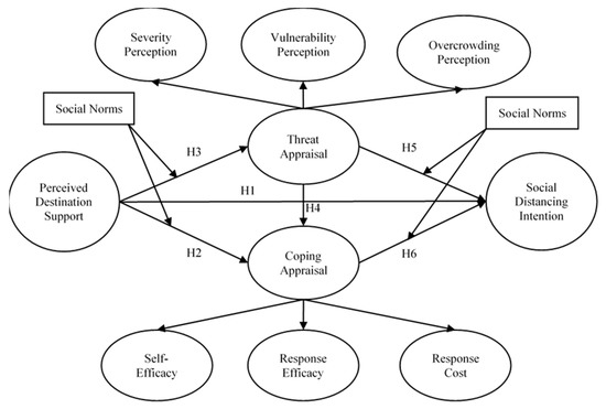 These two cognitive appraisals both result in adaptive or maladaptive coping modes [26], for example, in mask-wearing behaviors [39] and stay-at-home behaviors [40]. Moreover, coping appraisal is better than threat appraisal in predicting tourist behaviors [41]. The relationship between these two appraisals has been verified, and threat appraisal has a positive and significant influence on coping appraisal [17]. Based on the relationship between cognitive appraisals and tourists’ protective behavioral intentions, the following hypotheses are proposed: