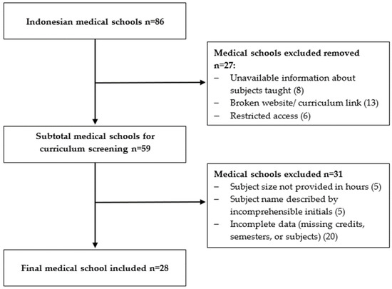 Flow chart of website search for information on medical degree bachelor stage subjects in the 86 Indonesian medical schools. Twenty-eight medical schools fit the inclusion criteria and were included in the analysis.