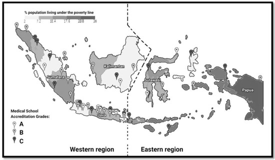 Distribution of all medical schools across the Eastern and Western regions of Indonesia and percent population living under the poverty line [14,17].