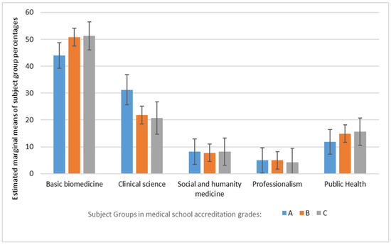 Estimated marginal means of subject grouping percentages in the bachelor phase of medical schools in Indonesia.