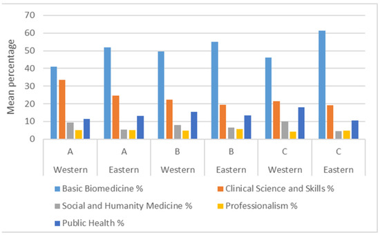 When comparing the Western against the Eastern region medical schools (Figure 4), the curriculum profiles appear similar for the Western and Eastern regions for accreditation grades A and B, suggesting no influence of geographical region in the curricula taught. Although only six schools were included in the accreditation type C, Eastern region schools had statistically significantly (p = 0.035) more Basic Biomedicine subjects compared to the corresponding Western region schools with the same accreditation.