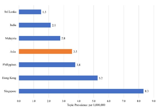 Asia averaged a baseline of 3.55 words per million. Singapore had the most narratives on caregivers (8.32 words per million), while Sri Lanka had the fewest (1.48 words per million). The sizes of conversations can be found in Figure 1, and the topics that make up the societal narratives on caregivers are in Table 1.