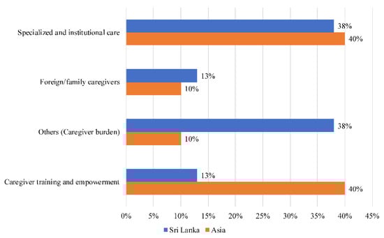 Similar to other developing countries with scarce resources, institutional care in Sri Lanka is severely limited []. The long-term care facilities in Sri Lanka that do exist suffer from a severe shortage of qualified and trained healthcare staff. This has led to a prevalence of errors in the prescription, administration and storage of medication—errors which untrained caregivers are unable to detect []. It is therefore a major cause for concern that the topic of training caregivers accounts for only a tiny fraction of the narratives. The prevalence of topics pertaining to caregiver burden further underscores the need for society to have more discussion on caregiver training and empowerment to enable caregivers to become more adept at both providing care and managing caregiver burden.