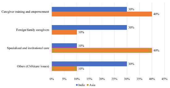 Thirty percent (30%) of the narratives in India (Figure 3) were on family caregivers (family, role, support), 30% were on caregiver training and empowerment (training, support, program) and another 30% were on issues related to childcare (infant, child, scheme). Childcare-related topics were present only in India. The last 10% of narratives were on specialized and institutional care (hospital, patient, visit), which was far below the Asian average of 40%.