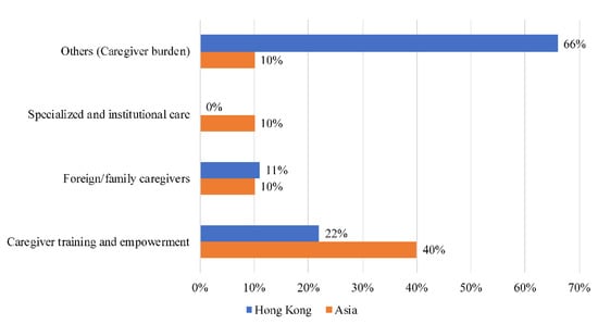 Sixty-six percent (66%) of narratives were about caregiver burden (stress, toll, mental) in Hong Kong (Figure 4)—the highest of the six countries and more than six times the Asian average. In total, 22% of narratives were related to caregiver training and empowerment (support, organization, volunteer). Topics concerning foreign caregivers (Filipino, foreign, worker) accounted for 11% of the total. In contrast to the rest of Asia, there were no topics concerning specialized and institutional care in Hong Kong.