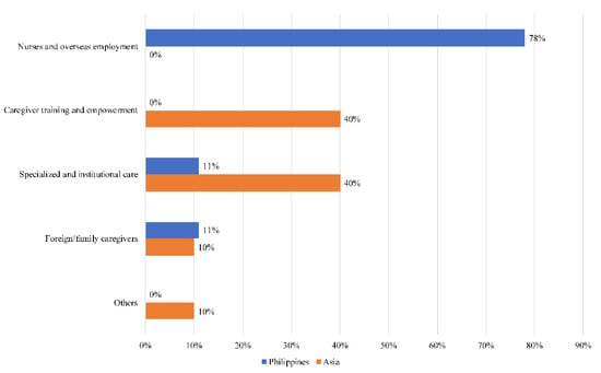 Currently, there is limited discourse on specialized and institutional care in both India and the Philippines, since family-centred care remains the dominant mode of care provision in both countries. Although both countries are not aging as rapidly as the others, both lag behind in terms of GDP growth []. As fertility rates inch downwards and life expectancies rise, it will only be a matter of time before the financial pressures imposed by an aging population become palpable. More discourse must be generated on how to manage the imminent increase in long-term care needs under the constraints of limited economic resources so that the demands of long-term care do not outpace the speed of economic growth. Countries such as Singapore and Japan make useful points of reference, with both having pivoted towards developing community-based models of care to meet the rising demands of long-term care in an economically viable manner [,].